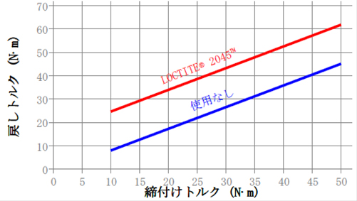 通常、ねじのゆるみ止め剤を使用していないねじの戻しトルクは、締め付けた時のトルク値より15~30%少なくなります。右記のグラフは戻しトルクへのLOCTITE®2045™の効果を示しています。